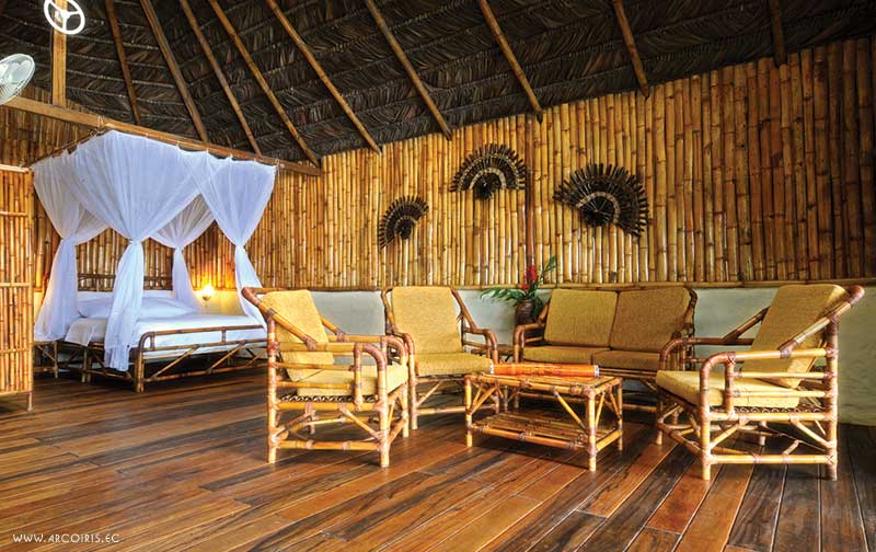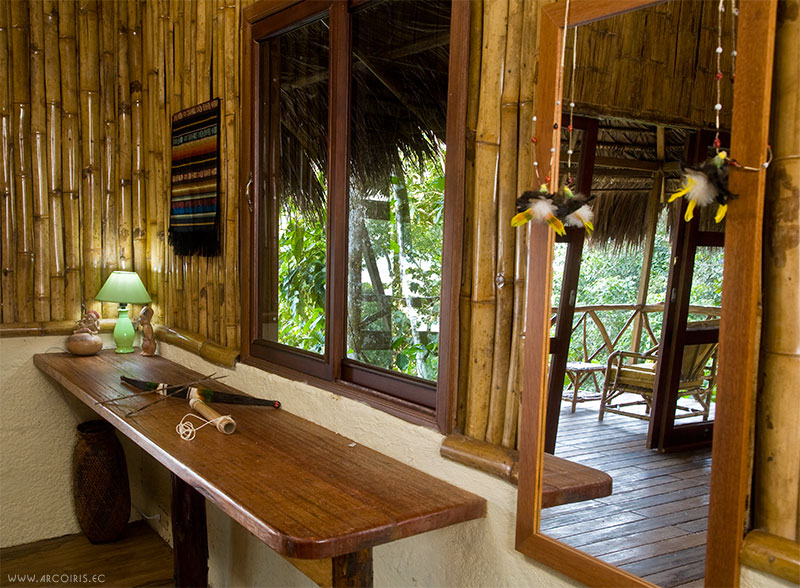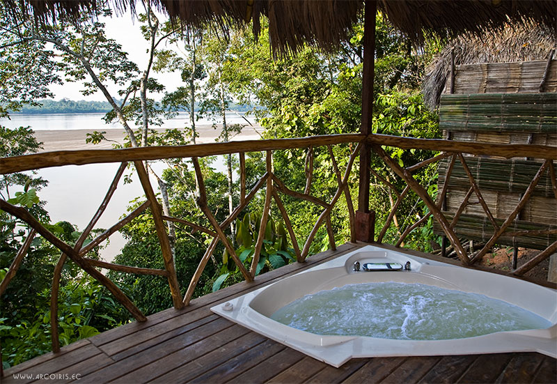 Nuestras cabañas, construidas usando materiales tradicionales locales, encajan perfectamente en el ambiente selvático y le haran sentir el sabor de la naturaleza intacta de la selva con el confort de la vivienda moderna. Cada cabaña tiene techos altos, su terraza privada con una hermosa vista al bosque, pantallas de ventanas anti-insectos, electricidad y agua caliente permanente. En cada cabaña hay una cama de dos plazas y media (queen size) y, bajo su requerimiento, se puede añadir una plaza adicional.