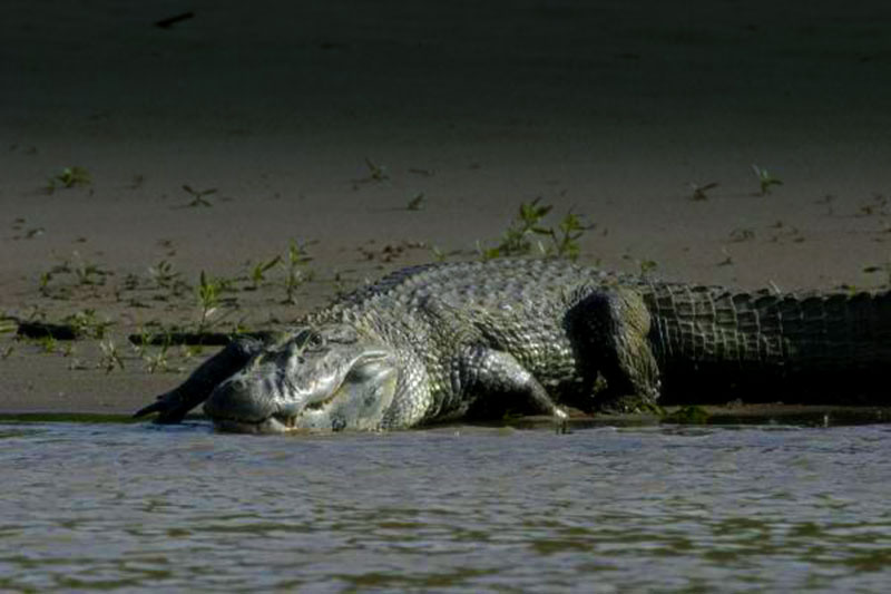 La población de caimanes negros esta en peligro de extinción desde hace mucho tiempo. El Lago Curvo de aguas negras es uno de los lugares donde se los puede apreciar: aquí estos animales están a salvo. El caimán negro puede llegar hasta cinco metros de largo, pero no es agresivo como se podria esperar de esos reptiles. Después de que el sol se pone, salen a cazar; sus presas son usualmente peces, mamíferos, pájaros y también anacondas. Con algo de suerte usted los verá nadando a través del lago desde la seguridad de una canoa tipica de madera.